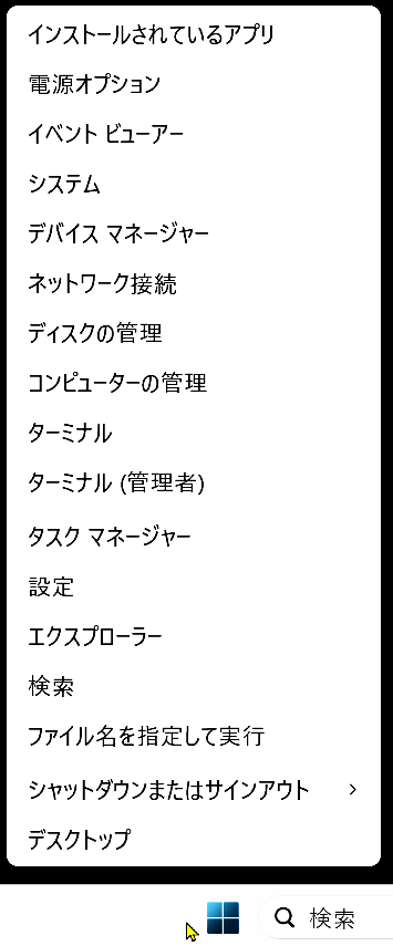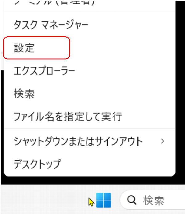 ・スタートボタンを右クリックするとメニュー内に「設定」がある