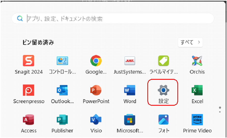 ピン止めされたアイコンの中に「設定」アイコンがある
