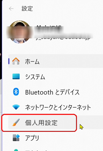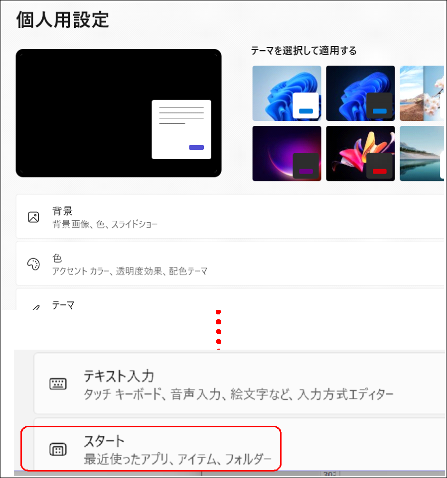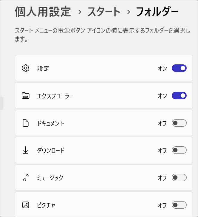⑤「個人用設定 > スタート」画面で「フォルダー」をクリックすると、
