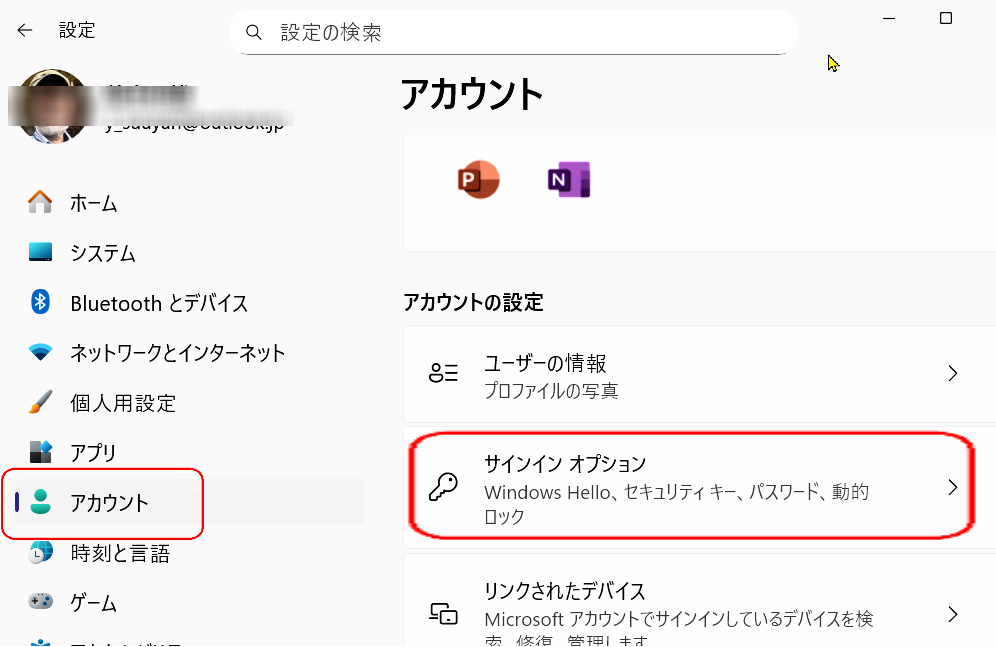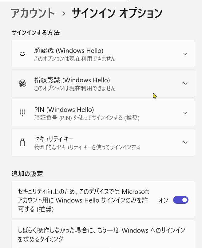①前項(pinの変更) サインインオプション内の「追加の設定」項目に