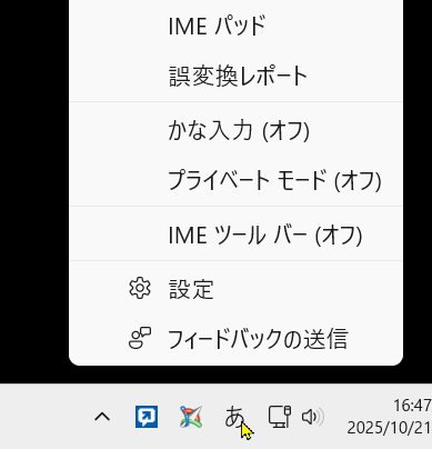 ①タスクバーの IME アイコン「あ」または「A」にマウスカーソルを合わせて