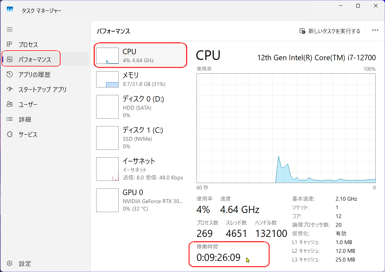 [タスクマネージャー]⇒[パフォーマンス]⇒[CPU] を選択する